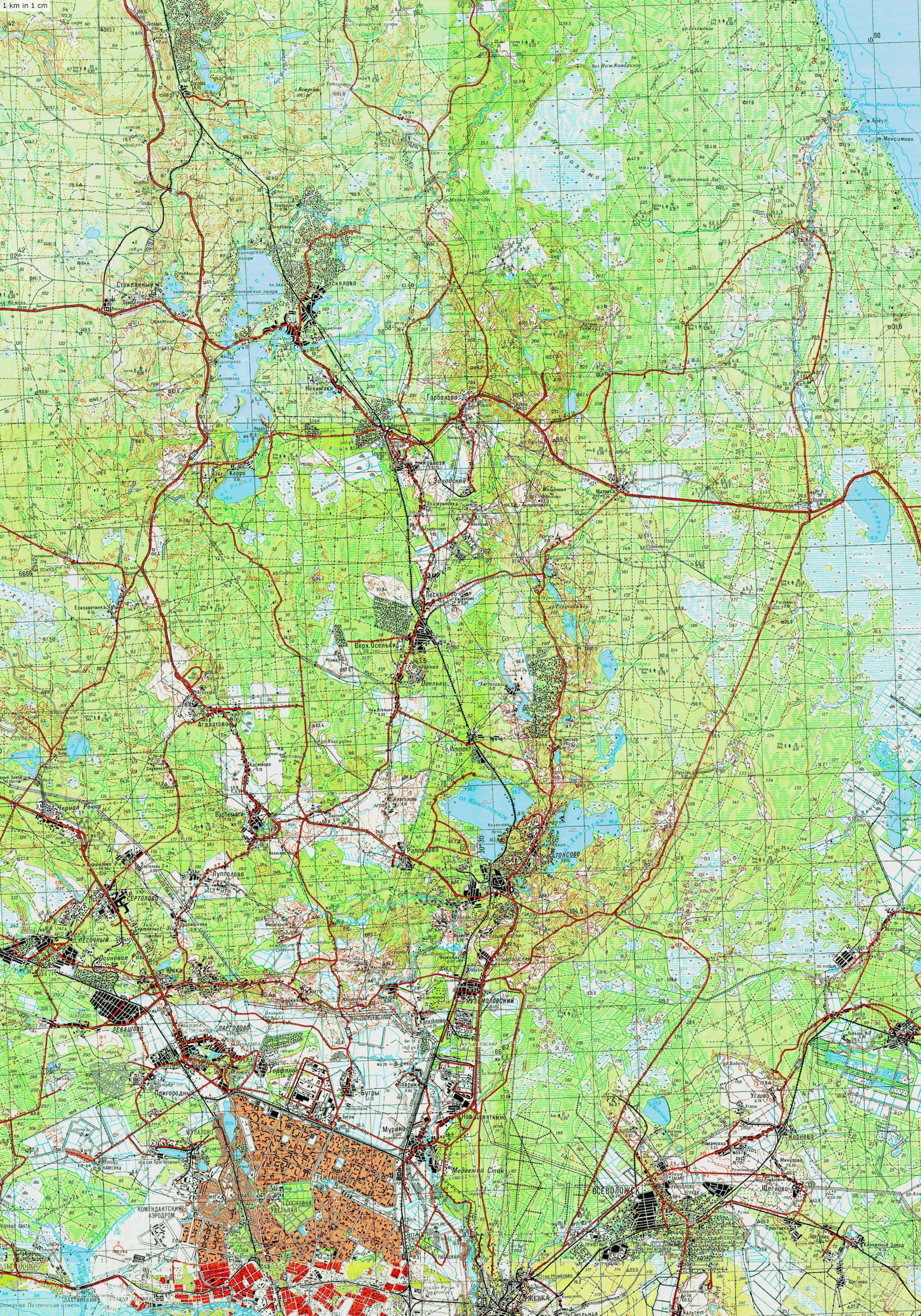 Подробная топографическая карта Всеволожского района Ленинградской области в масштабе 1 см = 1 км; 1:100000 с реками, озёрами, дорогами, посёлками, деревнями, сёлами, глубинами, высотами